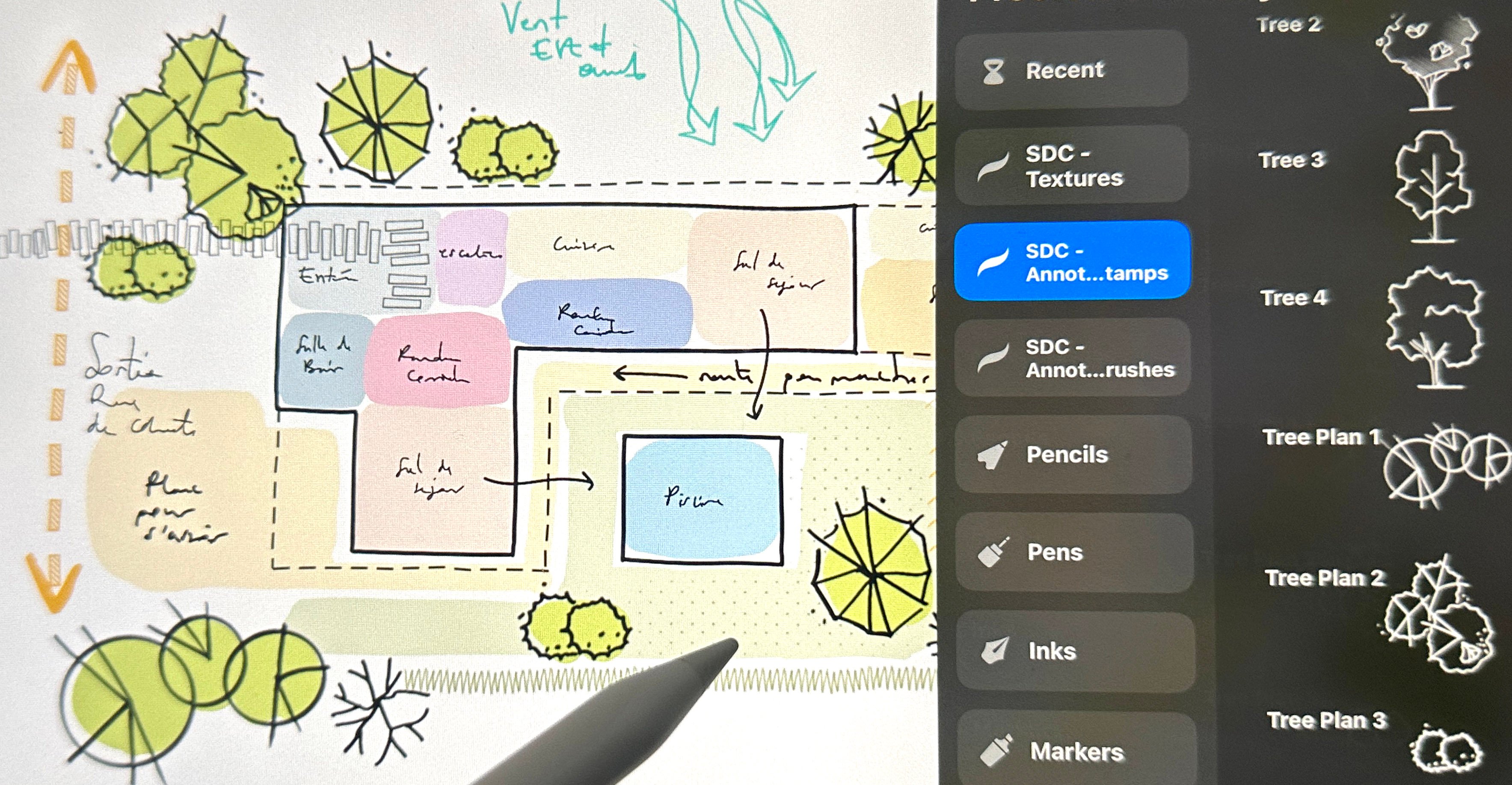 One of the ways I maximize the use of my iPad as an architect is with ready to use graphic templates or brushes I created myself. These are based on the things I use every single day, like people, tree brushes and some annotations to use in site analyses, concept diagrams, plans, and sections.